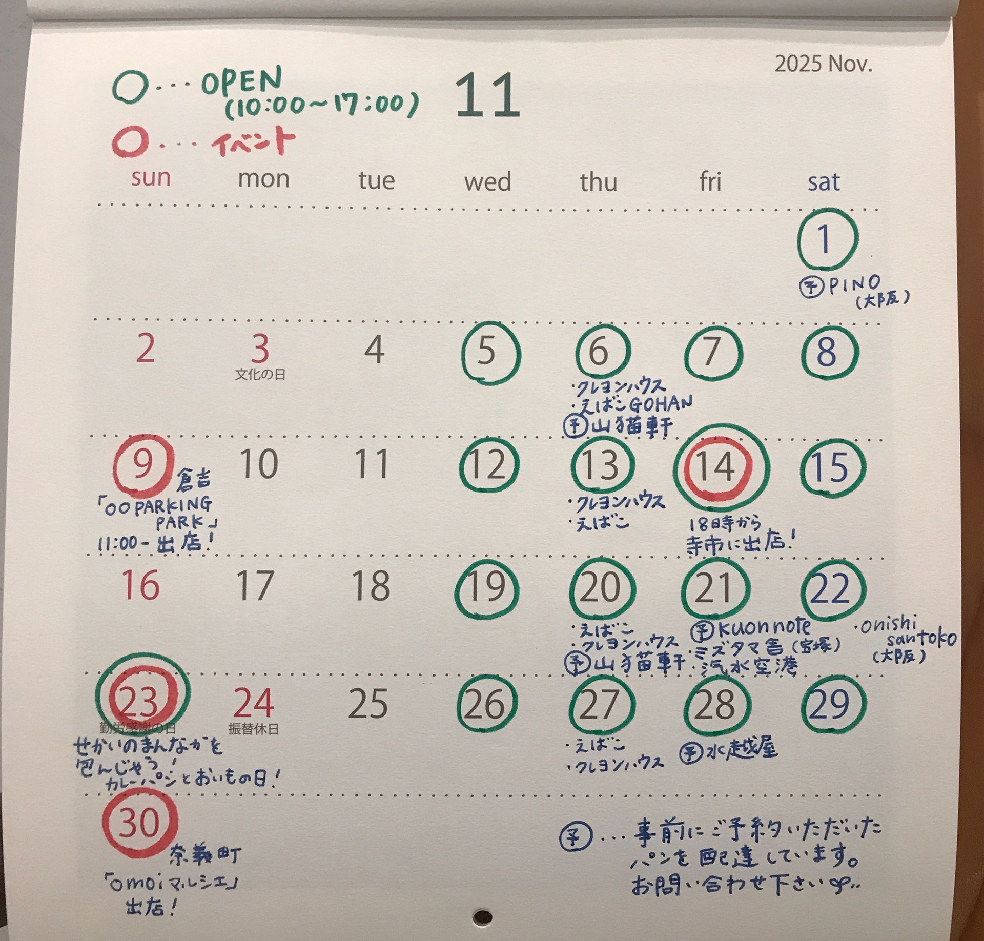 カレンダーの赤まるは、通常営業です。(^^) 日付の下に記しているのは、そこで楽童パンを販売していただけるお店です。事前にご予約をされた分のみ販売のお店もございますので、お問い合わせください。♪♪